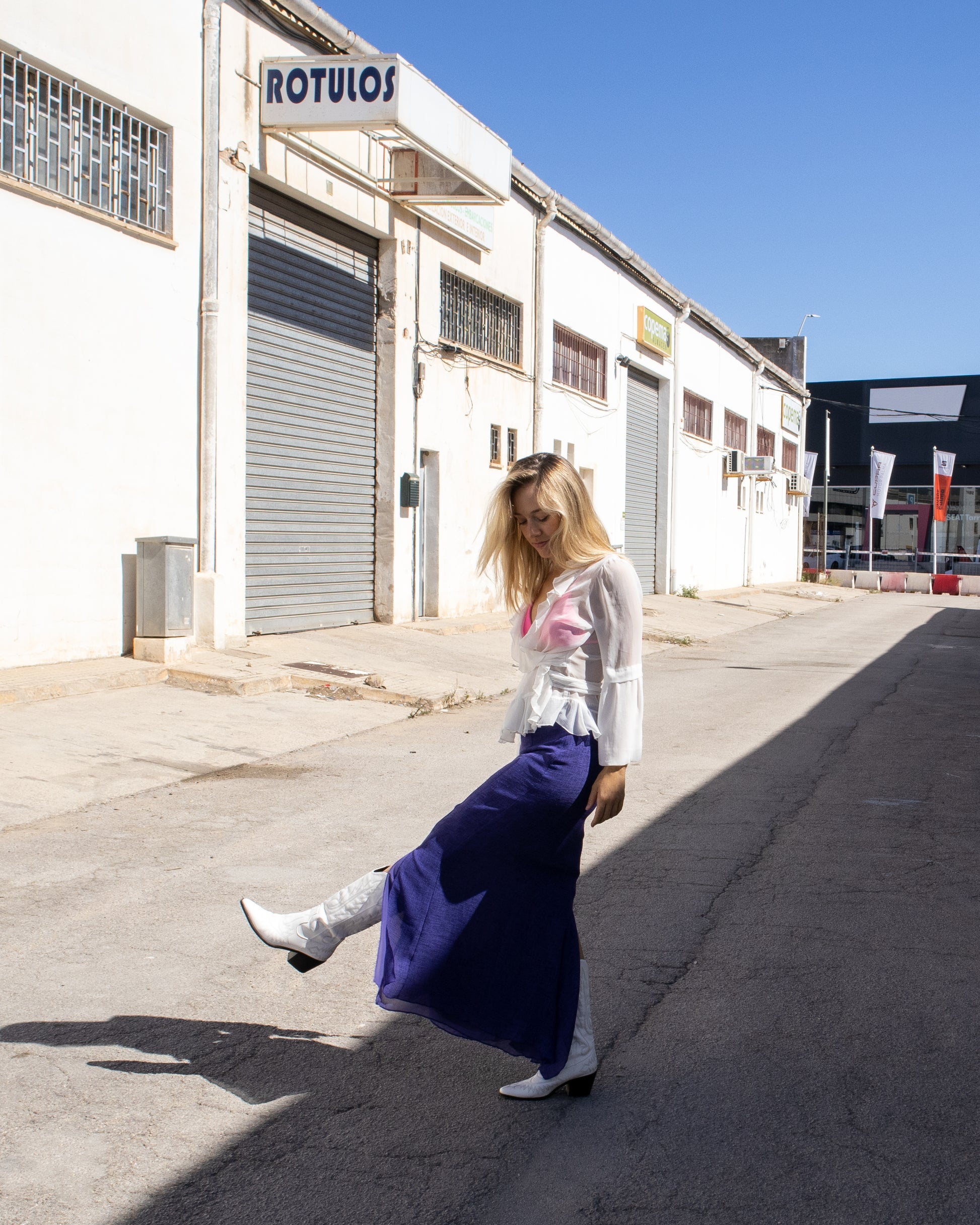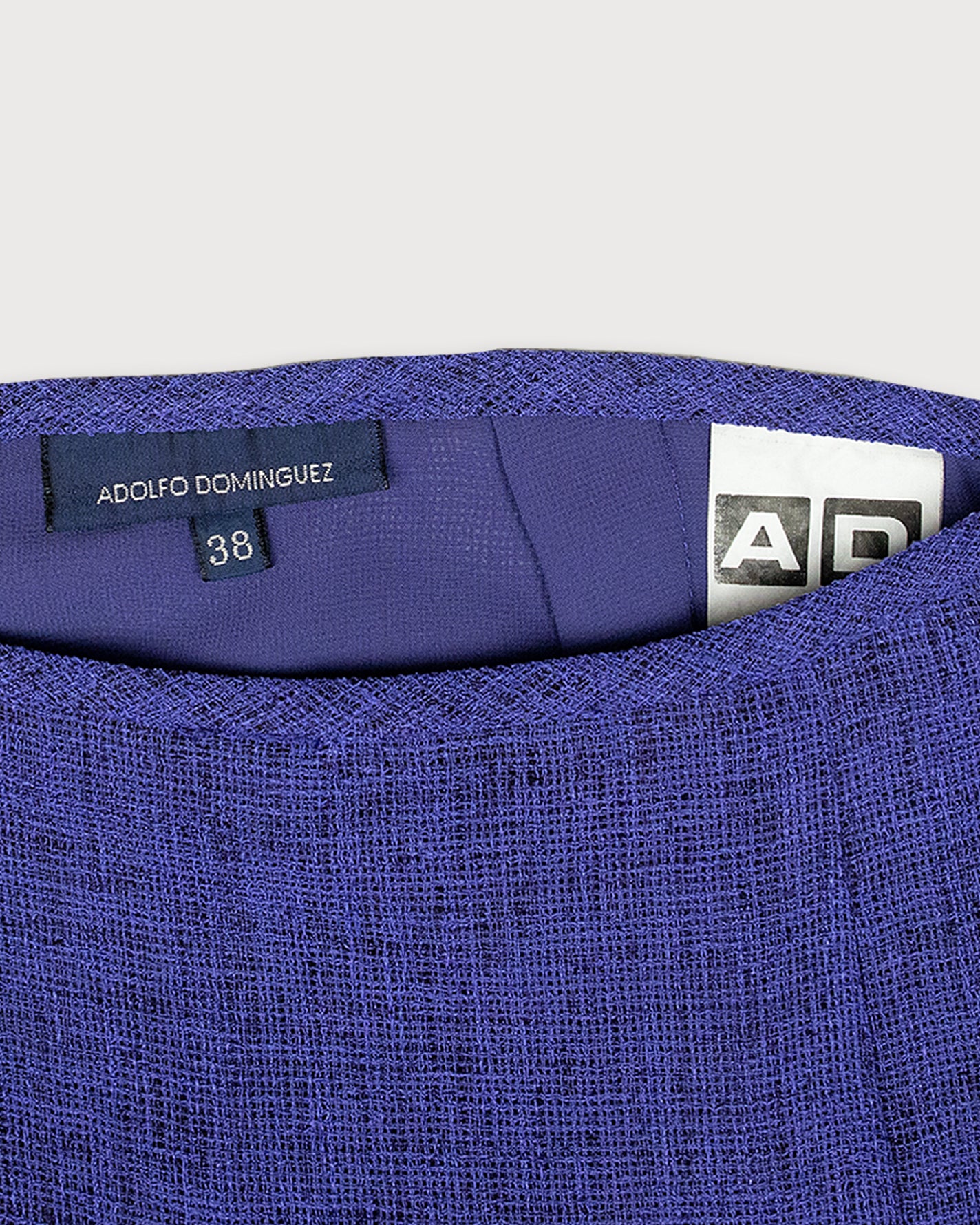 Falda midi textura color morado. Apertura lateral. Forro interior. Cremallera lateral.