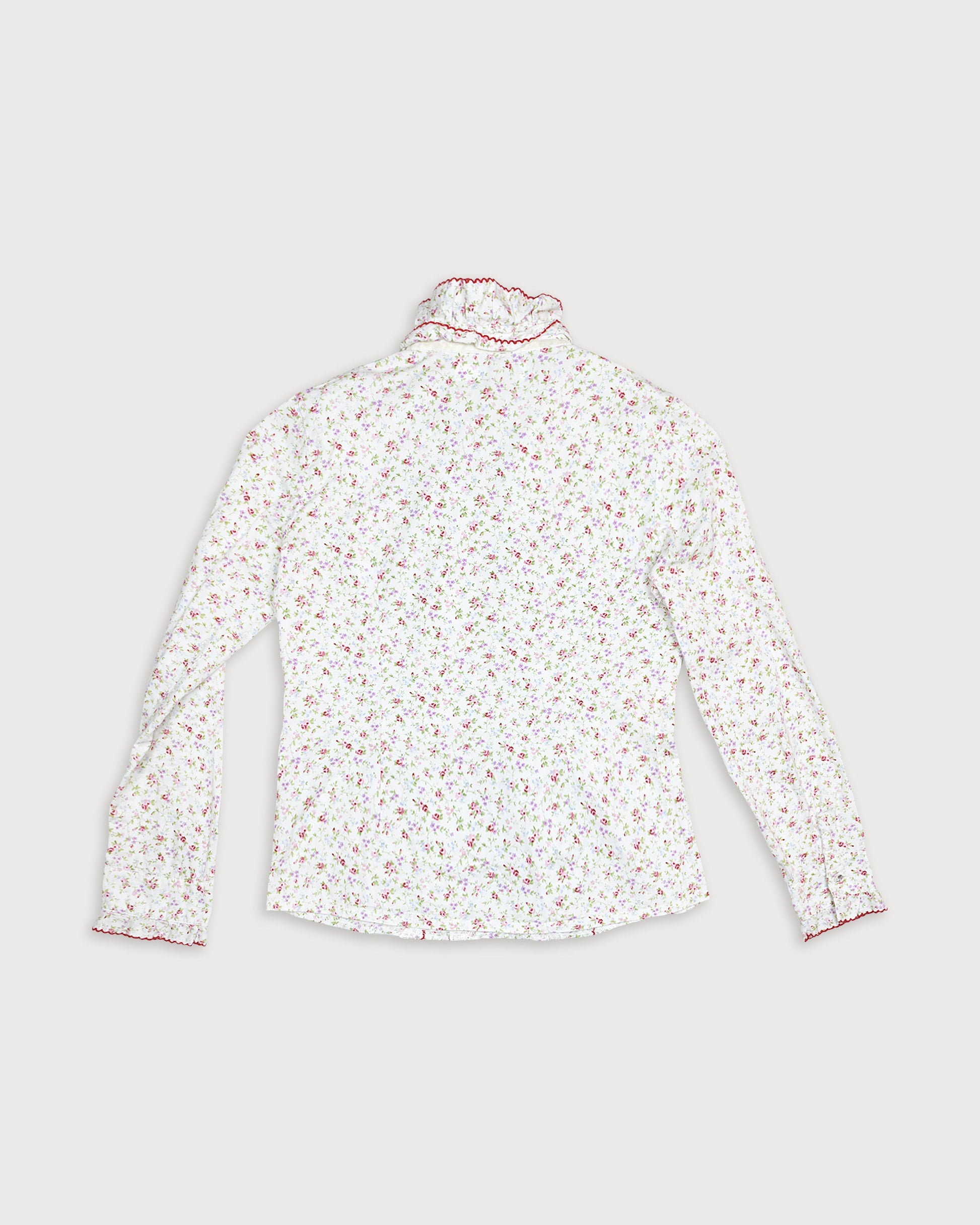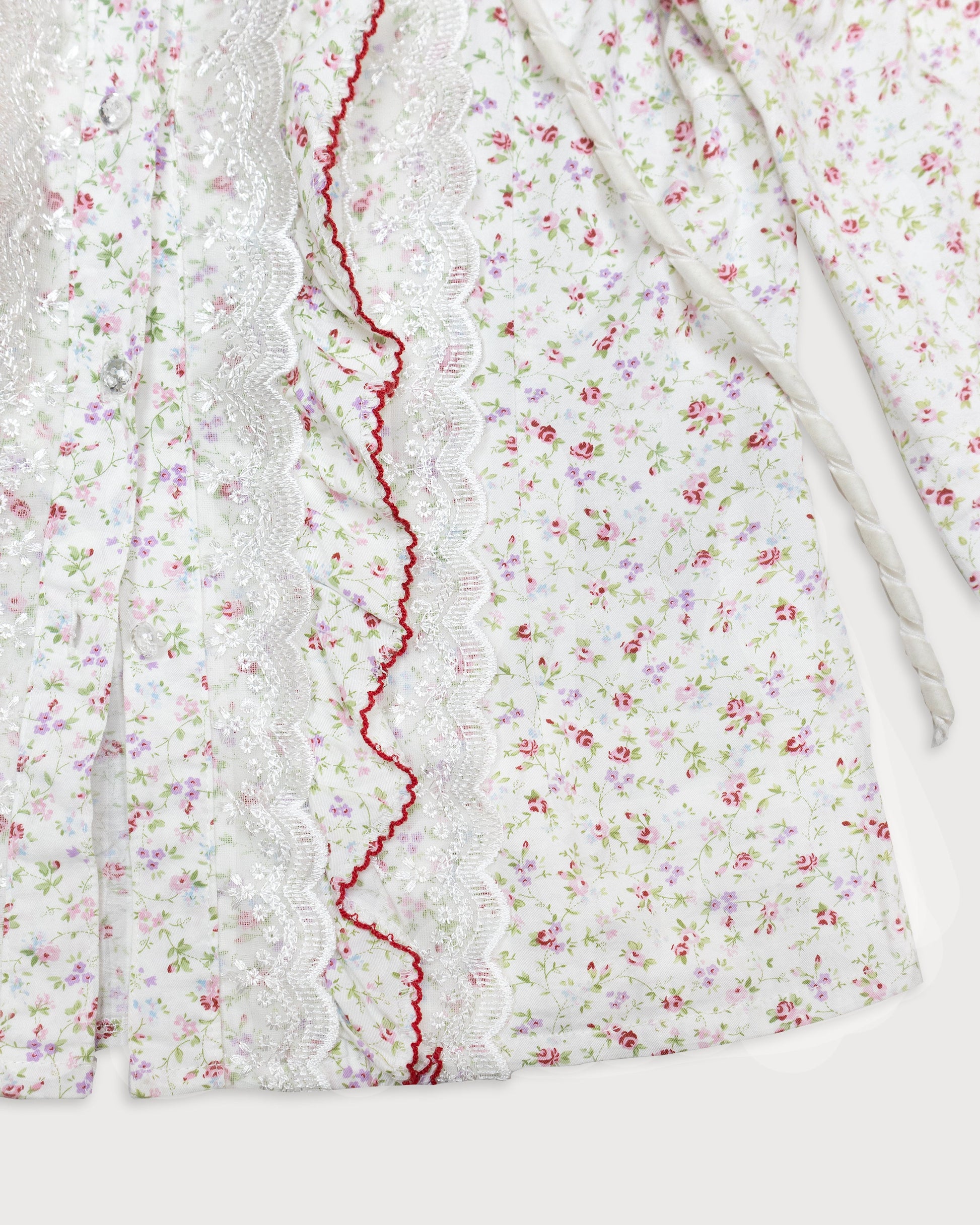 Cintas blancas en el cuello. Chorreras, volantes con borde rojo, volantes de puntilla *Defecto en una de las puntillas*
